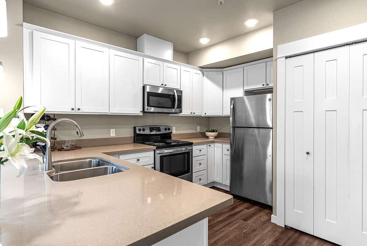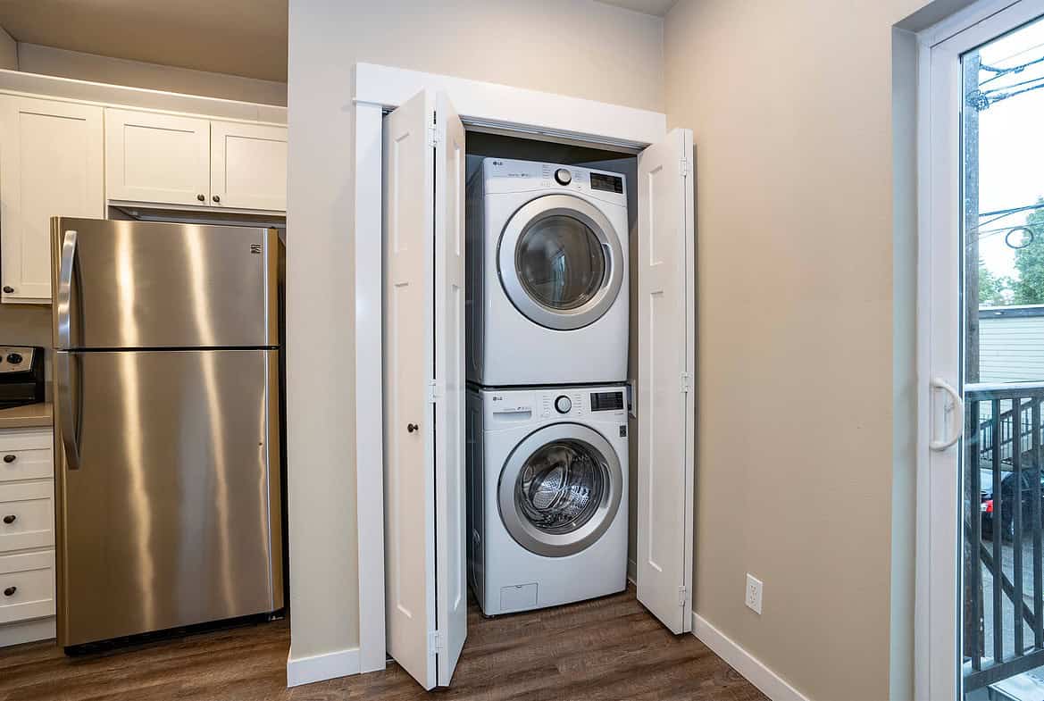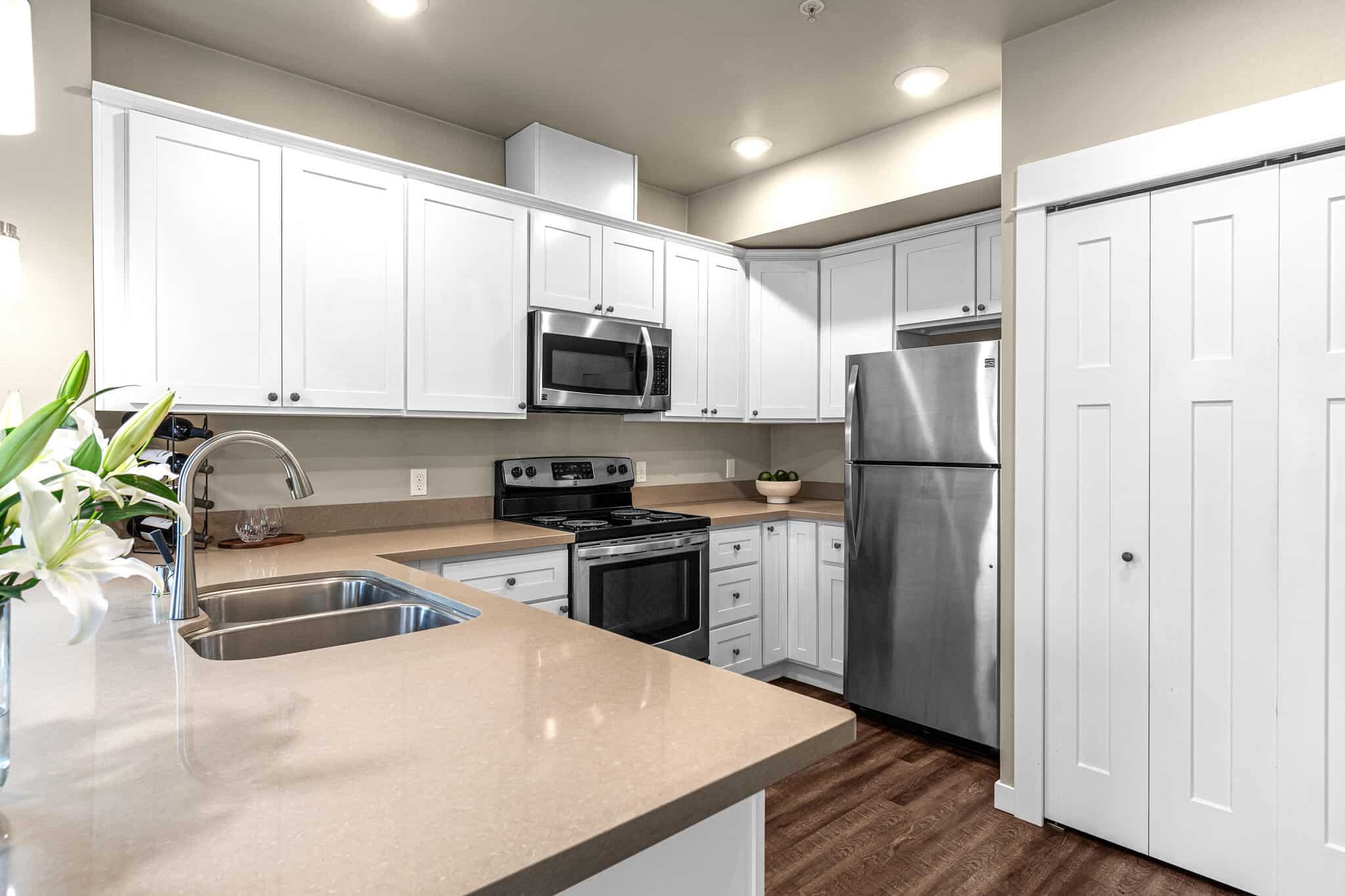 Nine Foot Ceilings, Spacious Fully Equipped Gourmet Kitchen, Stainless Steel Appliances, Convection Range, Shaker White Cabinetry, Quartz Slab Kitchen & Bath Countertops, Kitchen Island or Breakfast Bar, Front Load Full Size Washer & Dryer, Undermount Sinks w/ Designer Fixtures, Contemporary Recessed & Satin Nickel Lighting Finishes, Craftsman Style White Painted Millwork, Luxury Vinyl Plank Flooring, Zoned Heating, 50 gal Hot Water Heater, Keyless Electronic Access, Secured Building Access